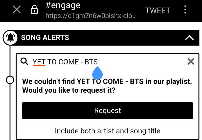 Debes cambiar el # por el de la canción que solicitaras y agregar el nombre de alguno de los chicos si solicitan su canción en solitario.Ejemplo:Hii @SiriusXMHits1 Can you guys play the new single “I'll be there” by JIN of @BTS_twt? Thank you so much ♡RECUERDA NO GENERAR SPAM, CAMBIA PALABRAS E INTERCALA EL TIEMPO
